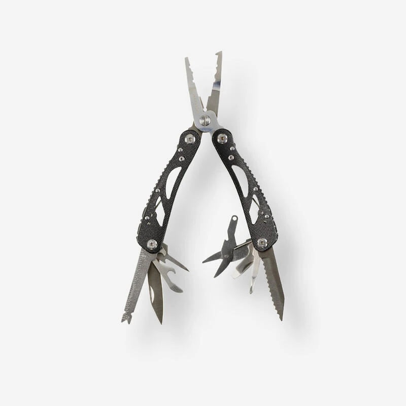 9 outils, + de 12 fonctions dont une pince qui coupe la tresse, les nylons et les fluorocarbones, serre les sleeves et ouvre les anneaux brisés.
